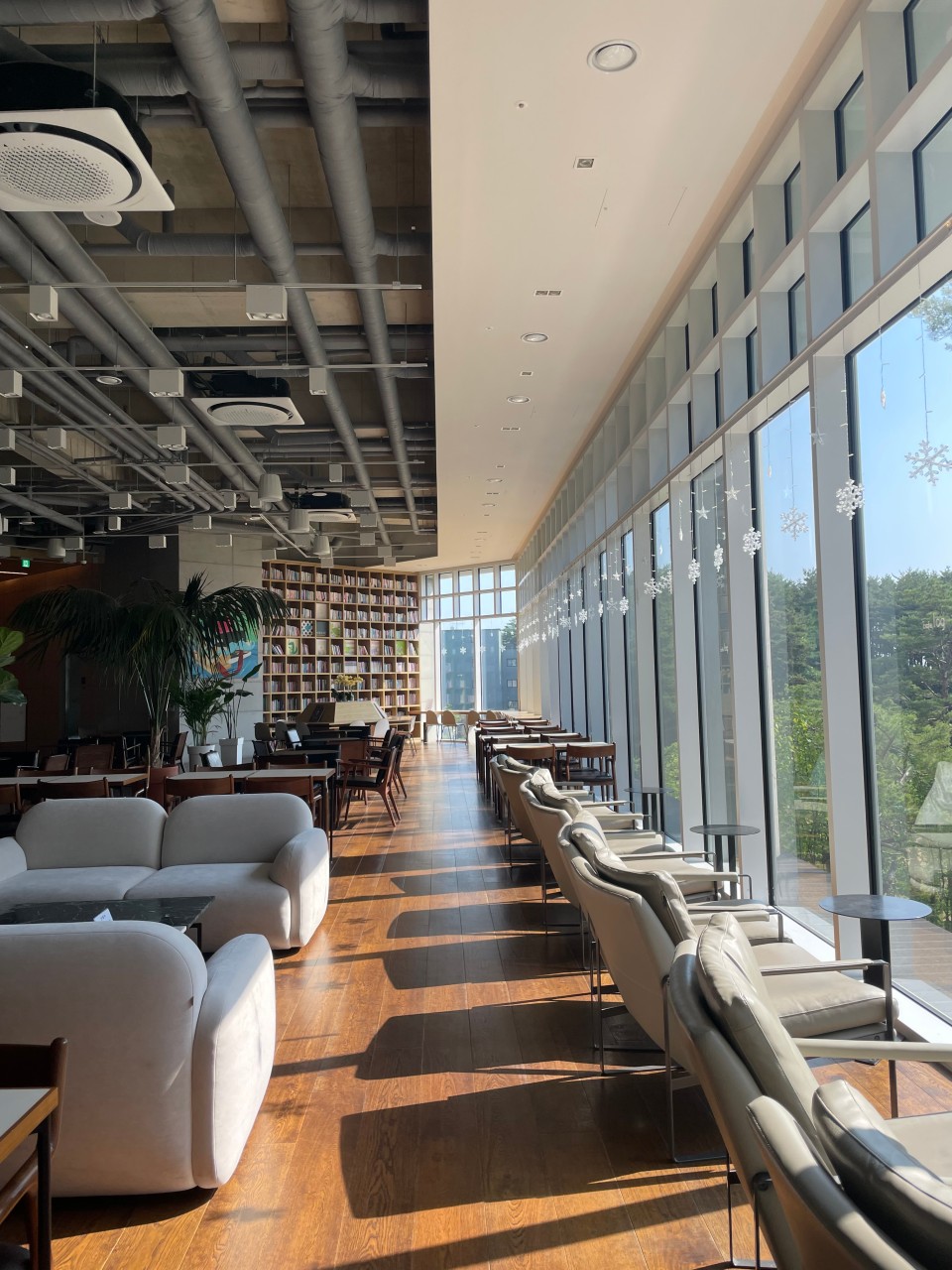 천장이 높고 통유리창이 넓게 나 있어 자연광이 실내를 가득 채우며, 창가에 앉으면 눈앞에 펼쳐진 소나무 숲이 힐링을 선사합니다.
