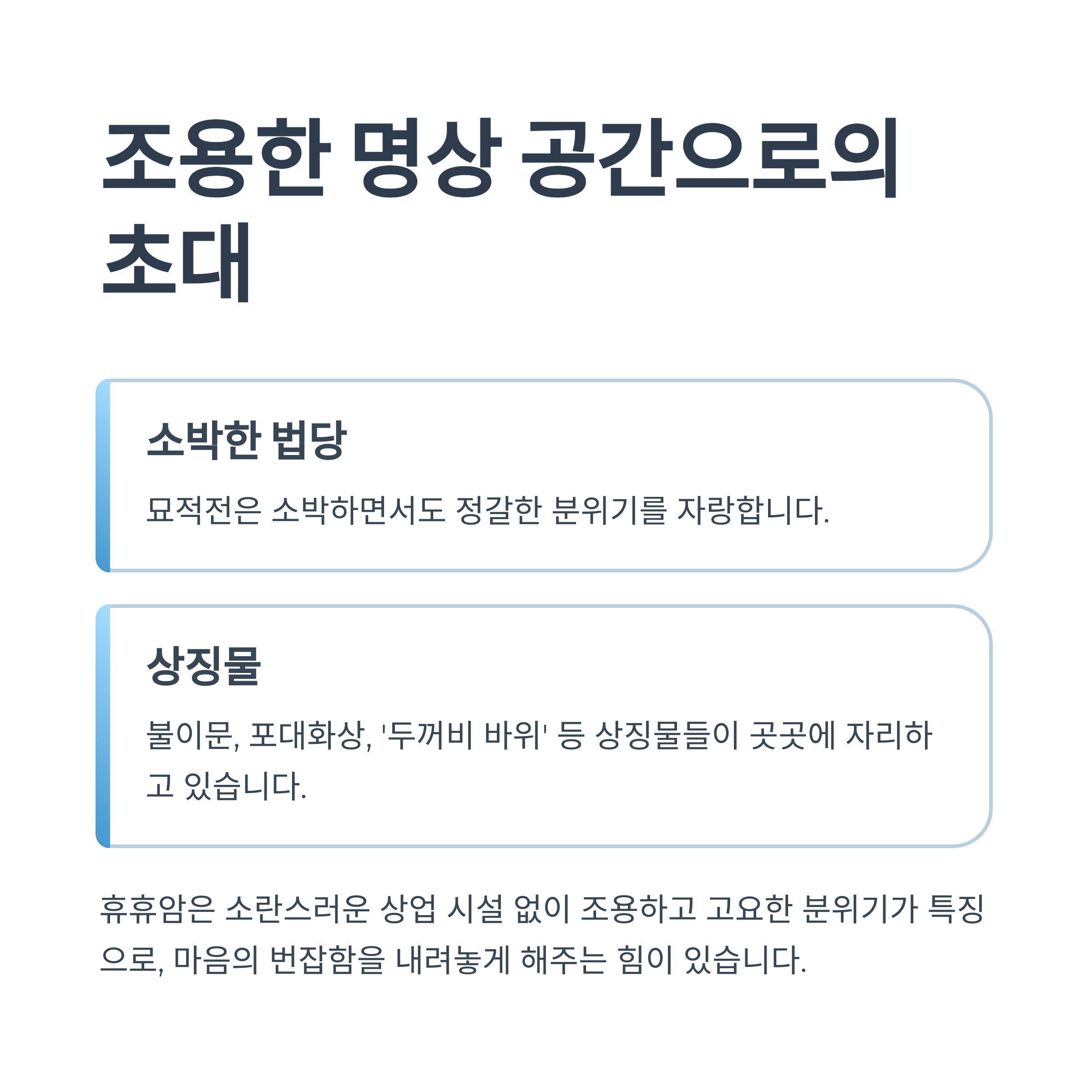 다른 유명 관광지와 달리, 휴휴암은 소란스러운 상업 시설 없이 조용하고 고요한 분위기가 특징입니다. 법당인 묘적전은 소박하면서도 정갈한 분위기를 자랑하며, 불이문, 포대화상, 그리고 ‘두꺼비 바위’ 같은 상징물들이 곳곳에 자리 잡고 있어 천천히 걸으며 명상하기에 좋은 환경입니다. 특히 바다와 바위, 불교적 요소가 함께하는 풍경은 마음의 번잡함을 내려놓게 해주는 힘이 있습니다.